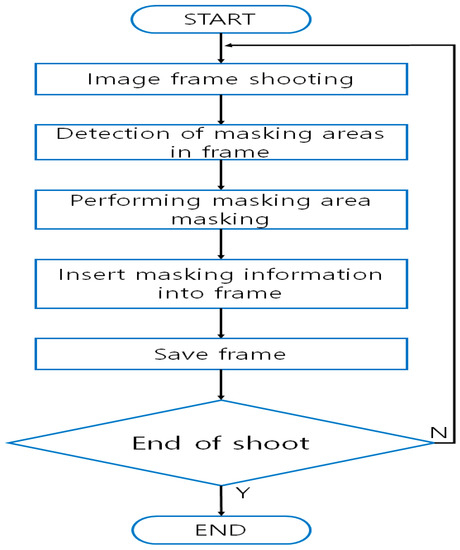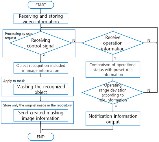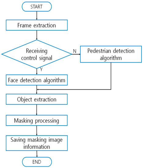 Video manipulation methods and devices that support privacy protection aim at preventing privacy infiltration when the images recorded on multiple VSSs are required to be sent to outside entity/entities that are beyond the jurisdiction of the VSSs. In cases where the video images are requested by, for example, law enforcement agencies, masking will be carried out with a receiver of control signals activated (Figure 3) [33]. When motion signals are received, the VSS will compare the operational status of the cameras against the regulatory information and check if they match. If they don’t, the system will transmit the match-failure result to the administrator. The invention comprises a storage module that stores the video images; an interface module that receives user input signals; an image processing module that performs masking on the portions of the video that are highly susceptible to privacy infiltration; and a control unit that sends out the masked images to outside entities [34,35]. The patented invention generates additional storage for masking within the storage module for the specific purposes of storing masked images and sending them to the user. The scope of masking refers to where the identification information is contained; however, the scope is designated manually [36].