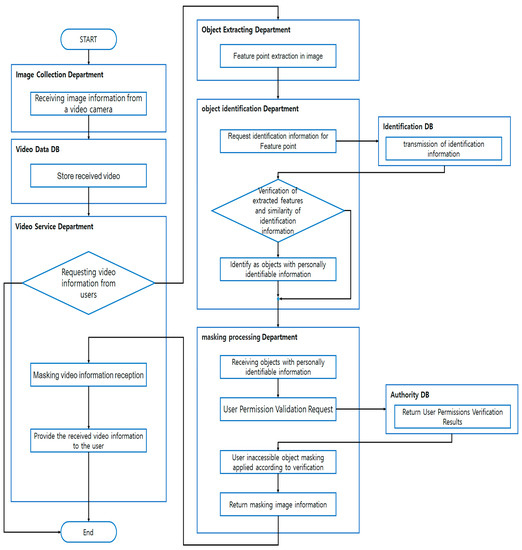 When the images are later requested by a user with proper access permission, the Proposed Mechanism will implement masking to the extent that matches the level of access permission he/she has, on object(s) that exceed the permission level. Regarding the other objects in the same images that are within the scope of the access permission level, the Mechanism will provide the user with the information about them in the form of original video images [38,39]. The Proposed Mechanism consists of an image collection module, an image DB module, an image services module, an object extraction module, an identification DB module, an object identification module, an access permission DB module, and a masking module. Figure 4 illustrates the sequences in which the Mechanism proceeds [40,41,42,43].