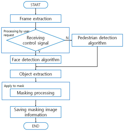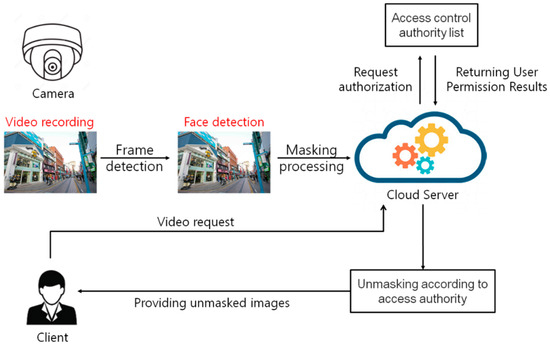Figure 5 shows the proposed mechanism. In the proposed mechanism, the identification object is extracted from the captured image, the object is masked and stored in the cloud server. If a request for the image is received, Only the masking of the authorized access object in the image is performed, and the restored image is provided to the user [44,45].