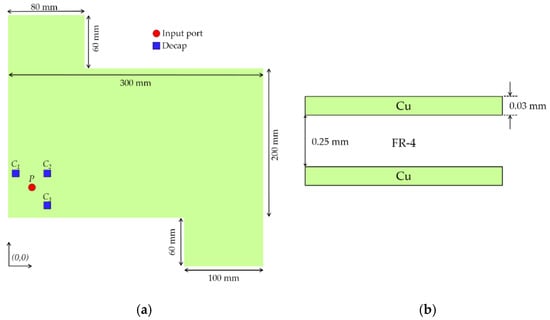 The test structure considered in this investigation, as shown in Figure 1, is a two-layer board built by two copper planes (electrical conductivity σcu = 58 MS/m, thickness tcu = 0.03 mm) representing a PDN with power (PWR) and ground (GND) planes, separated by a FR4 dielectric slab (relative dielectric permittivity εr = 4.3, loss tangent tgδ = 0.02, thickness tFR4 = 0.25 mm).