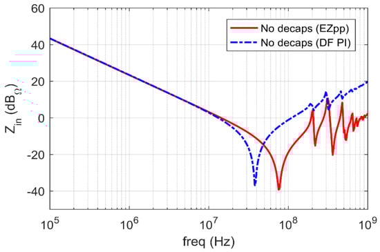 As mentioned, the benefit of decaps on the input impedance is more evident at low frequency so an optimization limited to fmax = 10 MHz has been carried out to better exploit the performances of EZpp and FD PI. Figure 12a and Figure 13a show the profile of Zin obtained by the two above-mentioned computational engines.