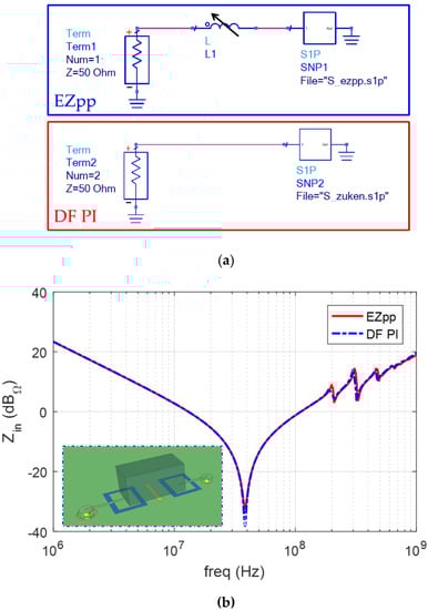 The largest difference between the results from the two solvers can be appreciated at high frequency, where Zin from DF PI exhibits an excess of inductance with respect to that from EZpp. This inductance can be quantified importing, in the circuit simulator Advanced Design System (ADS) [19], the S-parameters from the simulations without decaps and then adding a tunable series inductance between the termination port and the S-Parameter block of the circuit associated to the EZpp results, as depicted in Figure 3a. Tuning the inductance L1, the matching between the frequency spectra of the input impedance from the two solvers (Figure 3b) is reached using an inductance of L1 = 1.20 nH. According to the IEEE Standard P1597 [20], the feature selective validation technique [20,21,22] is used to quantify the matching of the two curves in Figure 3b. The matching is classified as “excellent” [20] being the FSV figure of merits GRADE = 1 and SPREAD = 1.