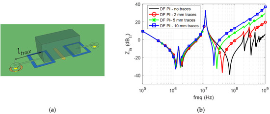 This conclusion is corroborated by a procedure in which the trace length ltrace (Figure 4a) is changed and the behavior of the input impedance is analyzed. In fact, if ltrace is changed from 0 (no traces, but vias) to 10 mm, Zin undergoes variations at high frequencies, as highlighted in Figure 4b.