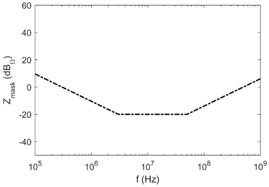 where N1 is the number of the frequency points (361 in the specific case) of Zin that are larger than a specific mask, Zmask (Figure 5), defined by the user, and N2 is the area between the mask and Zin. The factor 107 is introduced in order to avoid that N2 becomes predominant with respect N1.