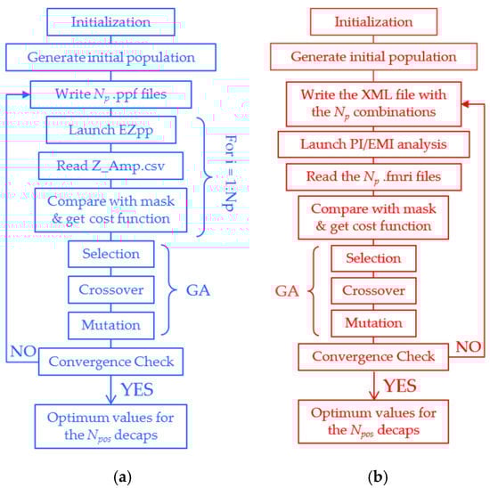 The nature-inspired algorithms (NIAs) [10,11] are a class of optimization algorithms inspired by natural mechanisms. They also include particle swarm optimization (PSO) [12], evolutionary algorithms (EA) [12], and genetic algorithms (GA) [13,14]. PSO is a population-based stochastic optimization technique; compared to EA and GA, the advantages of PSO are that it is easy to implement and there are few parameters to adjust. At the same time, not having evolution operators such as crossover and mutation, its efficiency in exploring the solution domain of the considered problem is limited. On the other hand, for the considered application, EA and GA have shown the highest efficiency from the computational point of view. Between them, GAs have a simpler architecture of the code. Computational efficiency and software architecture simplicity have stirred the choice of GAs as optimization algorithm for this work. The aim of this work is to explore, starting from simple configurations, the use of GAs as suitable algorithms for the optimization of the decoupling capacitance on a PDN at board level. In the following, a GA is adopted for finding the optimum number and values of decaps to be mounted on a simple PDN of a printed circuit board (PCB) with the goal to have an input impedance of the PDN below a specific mask selected by the designer based on the design specifications. The input impedance is evaluated through two different tools: EZpp [15,16,17] and PI/EMI analysis module within design force (from now on named “DF PI”) (by Zuken [18]). The results will be the base for more realistic and complex analysis that will be carried out in the continuation of this research.