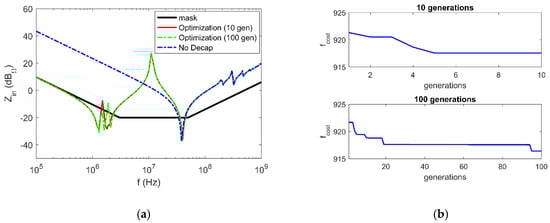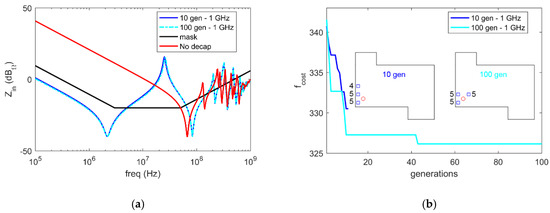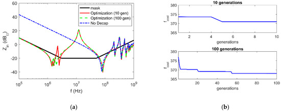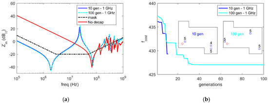 (a) Result of the optimization in EZpp after 10 generations (solid red line) and 100 generations (dotted–dashed green line) compared with the mask and the case without decaps. (b) Cost function fcost as function of the number of generations when maxgen = 10 and maxgen = 100.