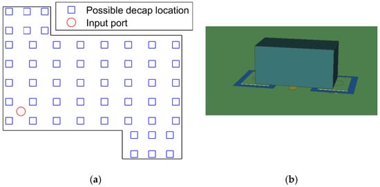 The previous section is devoted to the optimization of the value of three decaps, when their position is fixed. The same algorithm used for this task can be adapted for the optimization of the three decaps value as well as their position on the board. Different from the previous scenario, now the decaps values cannot vary from a minimum value (Cmin = 10 nF) and a maximum value (Cmax = 1 µF) in a continuous way, but in discrete steps. Defined Celem = 100 nF (ESR = 30 mΩ; ESL = 50 nH) as an elementary capacitance, in each of the Npos = 3 positions the algorithm can place from Ndec,min = 1 to Ndec,max = 5 elementary capacitances in parallel. The positions on the boards are not arbitrary, but they are uniformly distributed on a grid, as depicted in Figure 9a. Additional relevant difference concerns the solver DF PI: As described in previous sections, because of the presence of 2 mm traces connecting the capacitance component to the vias, Zin coming from DF PI exhibits higher inductance compared with the Zin from EZpp, which does not take into account neither vias and traces. So, in the direction of carrying on a more consistent comparison between the two solvers, the 2 mm traces have been deleted and now the capacitor is directly connected with PWR and GND planes through vias (Figure 9b).