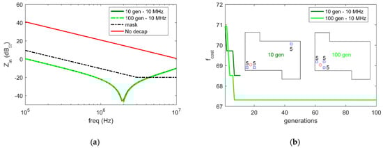 (a) Result of the optimization in EZpp up to 10 MHz after 10 generations (solid green line) and 100 generations (dotted–dashed light green line) compared with the mask and the case without decaps. (b) Cost function fcost as function of the number of generations when maxgen = 10 and maxgen = 100. The insets show the decaps placement after as maxgen changes its value and the number of elementary decaps in each position. The red circle represents the input port and the blue squares the position for the decaps.