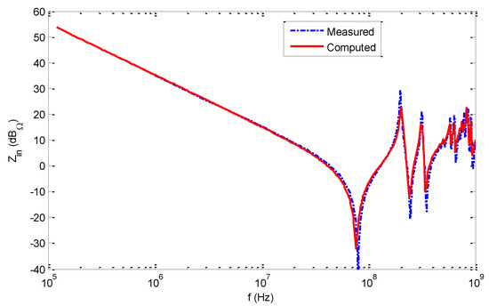 As a first check, the input impedance at the left bottom port P of the PDN board without capacitors (bare board) has been measured paying attention to also de-embed the mainly inductive effects of the connector. The comparison between the frequency spectrum of the magnitude of the measured input impedance and the same impedance computed by DF PI (the computational engine of the proposed optimization procedure) is shown in Figure 15.