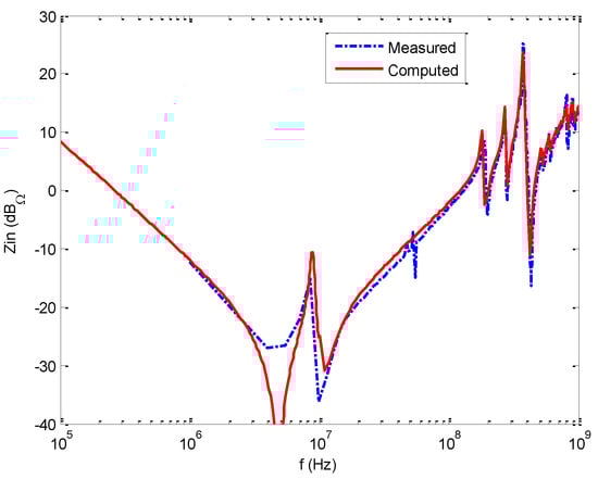 From Figure 17, it appears that the proposed computational procedure is able to catch either the low-frequency (capacitive) behavior of the PDN board or its high-frequency (inductive) one. Between 100 MHz and 1 GHz, the resonant modes of the physical board are well matched with those computed. The number of measured frequency point is less than the number of computed one. This is the reason for the difference of depth between the two notches at around 5 GHz.