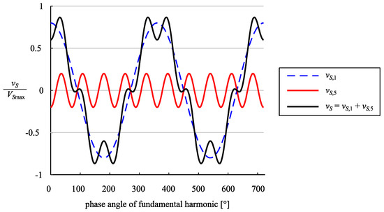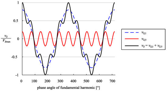 A worst-case example is illustrated in Figure 2, where the converter has to generate fundamental voltage harmonic vS,1 and the additional fifth harmonic vS,5; the latter exhibits its amplitude and its phase displacement φV5, so that the converter voltage vS reaches its maximal value VSmax. For the same fundamental voltage harmonic, vS,1 and the fifth harmonic with the same amplitude , but different phase displacement, the converter is not saturated (vS < VSmax), as shown in Figure 3.