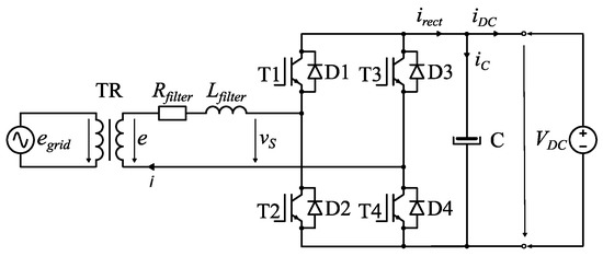 Many power electronics devices include a DC link and some kind of passive filter on the output or/and on the input. Typical representatives of these devices are grid connected converters and motor drive converters with L-filter. A simple generalized equivalent circuit of such a converter is shown in Figure 1, where the power converter is represented by an AC source with voltage vS(t) [25]. The task of a power converter is to generate fundamental, as well as higher harmonics. Thus, by properly generated voltage harmonics, the current harmonics can be controlled in steady-state.