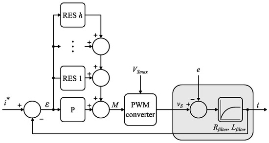Block diagram of load current harmonic control with proportional (P) and multiple resonant controllers (RES 1–RES h, where h denotes the highest controlled harmonic).