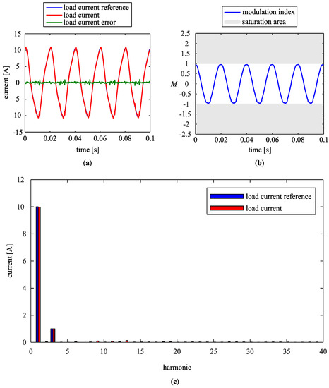 Figure 7a shows how actual load current i follows its reference value i*, which consists of fundamental harmonic with amplitude of 10 A and 3rd harmonic with amplitude of 1 A. Error signal is small, as the modulation index M remains slightly below 100 % (Figure 7b). Corresponding frequency spectra of the load current i and its reference i* are shown in Figure 7c.