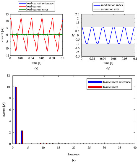 When the load current reference i* has been changed to contain fundamental harmonic with an amplitude of 10 A (as previously) and the third harmonic with amplitude increased to 2.3 A, the actual load current still behaves well (Figure 8a). As seen from Figure 8b, the modulation index M reaches 100%, leading the power converter just to the saturation limit. Consequently, harmonic distortion of the load current still does not occur (Figure 8c). Therefore, the fundamental load current and its third harmonic are generated properly.