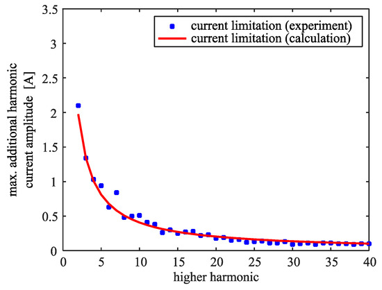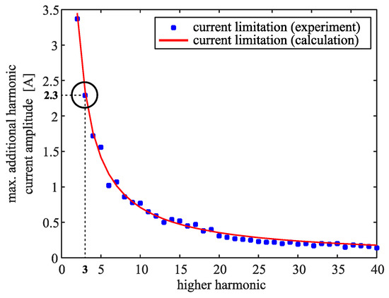 The procedure described above (variation of and φIh) for the converter’s saturation detection was repeated for each (h-th) harmonic from 2nd to 40th (in this case-study chosen as the highest one), giving an array of corresponding experimental maximal amplitudes . In Figure 10, these experimental results are shown in comparison to the maximal amplitudes of the controlled harmonic current , calculated by the derived analytical expression Equation (15). For example, the highlighted point at the third harmonic in Figure 10 has been obtained from the measurement, shown in Figure 8a, where the load current contains a fundamental harmonic with amplitude of 10 A and the third harmonic with an amplitude of 2.3 A; this load current led the converter to its saturation limit.