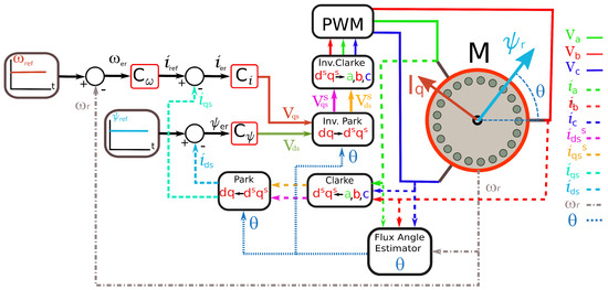 The overall system model is composed of the motor model and the controller model. Hence, the complete system dynamical equation is formed by the five differential equations of the motor given by Equation (1), the two flux estimator differential equations given by Equation (3), and the three differential equations of the PI controllers given by Equations (8)–(10). It is convenient to define the motor state using