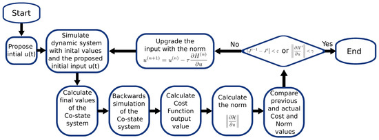 There are several methods to find , and that satisfy optimal conditions (19). The steepest descent is an iterative method that is easy to understand. The method is summarized in Figure 2. First, an initial discretized for is proposed. Using u, the estate is found by forward simulation, and the co-estate is found by backward simulation. At each iteration, small improvements are made by changing u according to