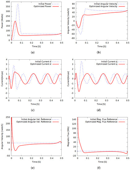 In Figure 3 and Figure 4, two of these simulations are shown. As can be observed from these simulations, the optimization procedure changed the references. As a consequence of this change, peak values were notably reduced. Particularly, it can be observed from the graphs that optimization of references and reduced the mechanic stress by reducing the peak angular velocity value and smoothing the acceleration. Optimization also reduced the peak values of and , which are the optimization target variables. If the motor demands less current, the required voltage will be less. Reductions in the current and voltage peak values mean less peak power is needed.