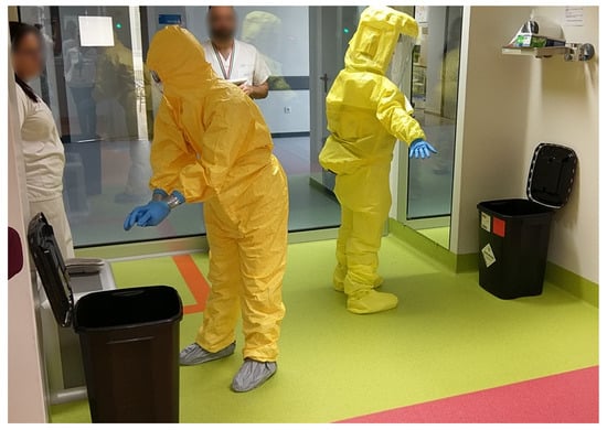The removal task involves several steps. During this activity, the actuation protocol states [11]: “We will always act slowly, calmly, being aware of our body and proceeding with slow but precise movements. Even feeling that we are accustomed to this activity, we will never stop listening and attending to the indications of the instructor-observer, which will indicate to the personnel the sequence for the removal of the PPE”. The first pair of gloves, as well as the first pair of boot covers, are discarded in the patient’s room. Gloves are always disposed, while other components are stored for their posterior sterilization and reuse. Once in the changing room, the steps that must be followed are reported in order: (1) remove the second pair of boot covers; (2) remove the second pair of gloves; (3) open the front closure of the suit; (4) remove the suit head cover, remove the suit arms and legs, remove completely and roll it up for storage; (5) remove the third pair of gloves; (6) perform first-hand hygiene; (7) put on a new pair of gloves; (8) remove the waterproof glasses; (9) remove the FFP3 mask; and (10) remove the new pair of gloves [11]. Figure 1 illustrates the removal of the second pair of gloves once inside the changing room.