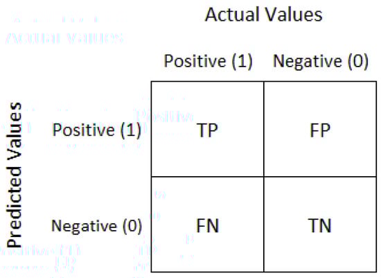 All the aforementioned classification algorithms were evaluated on four performance metrics: accuracy, precision, recall and score. These metrics can be obtained from the parameters reported in a confusion matrix (Figure 3):