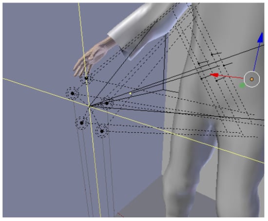 This dataset includes 30 images of 960 × 480 pixels, taken with a fixed simulated focal length of 4.8 mm. These images represent the whole protective suit subdivided into six different areas (Figure 6): chest, abdomen, pelvis, thighs, lower legs and ankles. Five different synthetic samples were generated for each of the six areas, each with a different point of illumination. The total time required for rendering these 30 simulated images was 15.75 s. To represent the data distribution of the physically emulated dataset, the synthetic dataset is also affected by a strong imbalance between the two class samples, where the stained areas represent 0.0006% of the total of 13,824,000 pixels, and the majority represent clean areas.