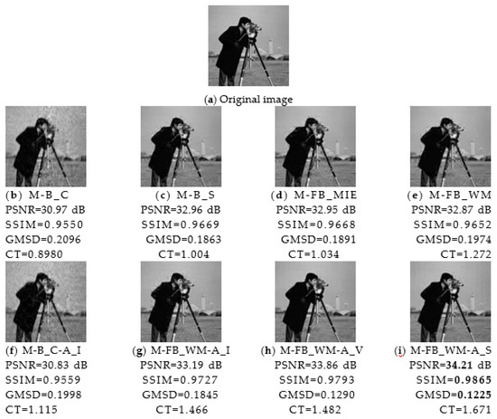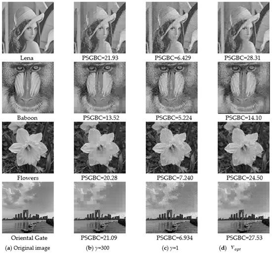 Furthermore, the differential threshold (γ)-based reconstruction algorithm and the -based error analysis reconstruction algorithm were compared in this article. Two standard test images and two real-nowadays images are adopted for the comparative experiment at the condition of Noise-std = 20 and TSR = 0.5. Experimental results show that the -based error analysis reconstruction algorithm has a significant advantage over the γ-based reconstruction algorithm in both PSNR and PSGBC (another composite index: PSGBC = PSNR × SSIM/GMSD/BEI/CT), which can be seen from Table 4, although there is a slight loss in BEI. Figure 8 shows the reconstruction images of these four images with differential threshold (γ) and error analysis () as the iterative stop condition.