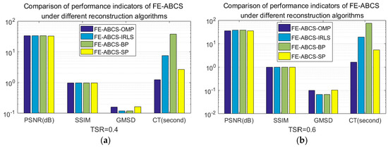 Furthermore, comparative experiments of the proposed algorithm combined with different image reconstruction algorithms (OMP, IRLS, BP, and SP) have also been carried out. Figure 4 is the data record of the above experiments tested with the standard image Lena under the conditions of TSR = 0.4 and TSR = 0.6, respectively. The experimental data shows that the proposal using these four algorithms has little difference between the PSNR and SSIM performance index. However, in terms of the GMSD index, the IRLS and BP algorithms are obviously better than the OMP and SP. In terms of calculation time, BP is based on the norm, its performance is significantly worse than the other three, which is also consistent with the content of Section 1.