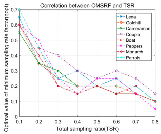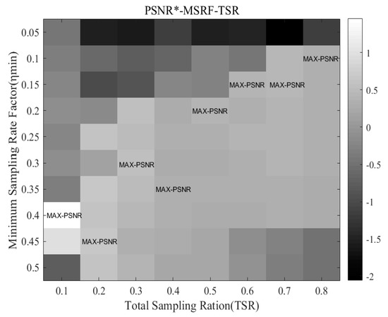 Figure 5 shows the analysis results of the test image Lena on the correlation between PSNR, TSR, and MSRF (). It can be seen from Figure 5 that the optimal value (maximizing the PSNR of Lena’s recovery image) of minimum sampling rate factor (OMSRF) decreases as the TSR increases. In addition, the gray value in Figure 5 means the revised PSNR of the recovery image ().