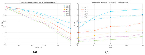 The correlation between the PSB, Noise-std, and TSR under the six different iteration stop conditions of Lena: (a) PSB changes with Noise-std, (b) PSB changes with TSR.