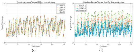 Correlation between , TSR, and Noise-std of sub-images: (a) Noise-std = 20, (b) TSR = 0.4.