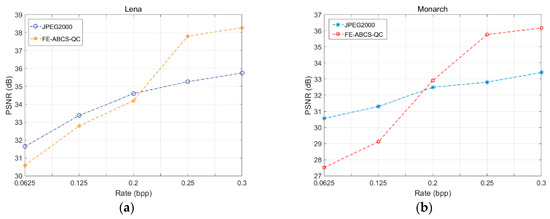Rate-distortion performance for JPEG2000 and FE-ABCS-QC: (a) Lena, (b) Monarch.