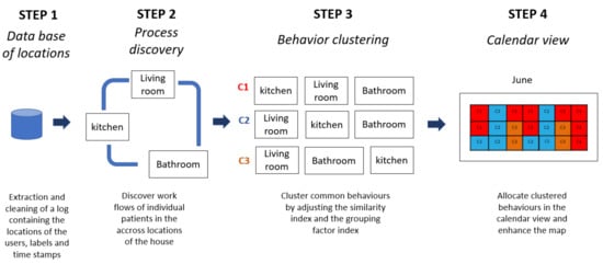 The proposed solution includes three main components: (1) Indoor Location Systems to track human activity in a house by means of sensors; (2) process mining tools and techniques, to discover and classify human behaviors, and (3) the calendar views, to display the human behavior patterns in the format of a schedule to identify patterns. Figure 1 depicts the developed methodology for this study, and the following subsections describe in detail the entire process.