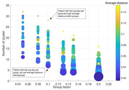 Figure 3 presents the number of clusters (y-axis) depending on the grouping factor index (x-axis). Since the number of clusters is a priory unknown, a quality threshold clustering method is applied to group patient trajectories into a data-driven number of clusters, but this technique needed a predefined quality threshold. Therefore, different thresholds were tested to assign behavior patterns into the same cluster. For example, for a group factor of 0.05, the technique groups behaviors in the same cluster if they are similar at a ratio of least 5%. As soon as the group factor increases, the number of clusters normally decreases, and the average duration of behavior normally increases. As a counterpart, if this relation is inverted, it means there are some unusual behaviors which are indicators of complexity in individual behaviors. At the same time, a higher number of clusters with the same grouping factor indicates a user featuring a complex behavior.