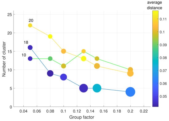Beyond the number of determined clusters, it is also critical to understand the number of elements included and excluded (outliers) in the clusters. In Figure 3, the size of the point indicates the average number of items per cluster for each grouping factor index. It can be observed that the clusters computed with a group factor below 8% have fewer items than the clusters with a group factor over 20%. Moreover, the filling color shows the number of elements not included in any cluster (outliers). It provides meaningful information. For instance, the number of outliers decreases with the increase of the group factor.