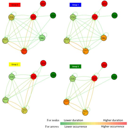 In Group 0, displayed by a red color, the patient stays more in the bedroom and living room. In Group 1, represented by blue color, time in the living room decreases, and the patient goes for a walk because the Hall shows that the last view of the patient is the entry door. In Group 2, shown by yellow color, and in Group 3, presented by green color, the patient does not go out of the house and stays more at home.