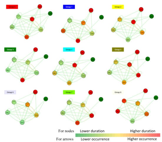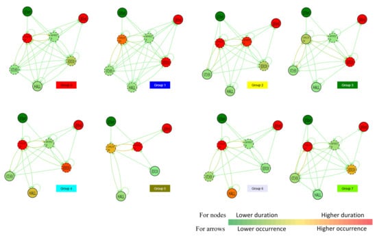 First of all, the number of clustered groups shows the complexity of the patient’s behavior. While Patient 18 has a stable behavior supported by the number of four clustered groups, Patient 10 has a complicated behavior that can be seen from nine clustered groups. The patient starts with only one room in some groups such as Group 1, Group 6, and Group 7, with more than one room in other groups. One typical behavior for Patient 10 is the transactions between the Kitchen and Living room is relatively higher than others; almost all groups. On the other hand, the spent time changes a lot for the same rooms. For example, the Hall is one of the rooms, which has the highest duration in Group 1 and Group 8. However, the patient did not spend much time in the Hall in other groups. In a general manner, the Living room is the most preferred room to spend time, and the Bathroom is the least used room for Patient 10. When the Living room is red, the Bedroom is green or yellow (except Group 1) and vice versa. Because of this, it can be concluded that the patient probably slept on the sofa, and it increased the spent time in the Living room.