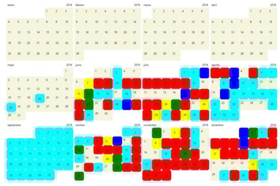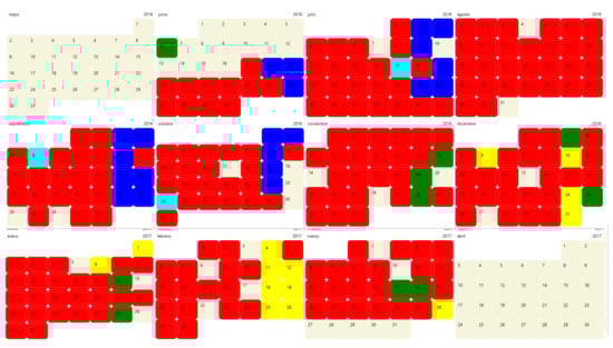 Figure 9 shows the calendar view representing the groups of the workflow view of Figure 6 for a group factor of 0.2. The border colors represent the group discovered by clustering and shown in the workflow view. There are much more differences among groups because colors are less stable. There is a month (July) that the behavior is very different. Although the behaviors presented by Group 0 (red color) are dominant in July, the behaviors presented by Group 4 (turquoise border), Group 2 (yellow border), Group 1 (blue color), Group 3 (green border) and can also be seen.