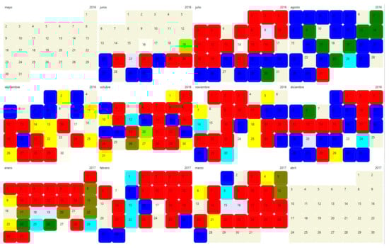 Figure 10 shows the calendar view for representing the workflow view. There are much more differences among groups because colors are less stable. Red colors (Group 0) are the most dominant behaviors. It is interesting that the number of blue colors (Group 1) is increased in the summer and December, and there is no blue color in January. The behavior presented by Group 5 is mainly encountered in January.