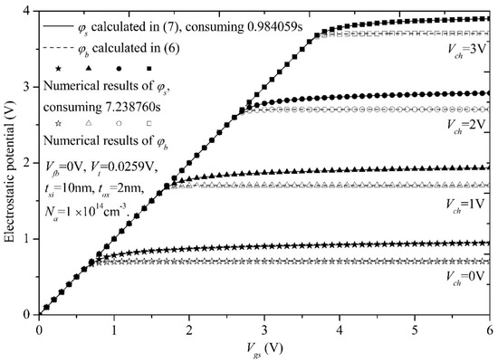 We compare φs of our scheme with that of the numerical method and show the results in Figure 2 and Figure 3. We observe that good agreements are obtained and computational efficiency of (7) is seven times that of the numerical method, as shown in Figure 2. Moreover, we analyze the absolute errors of φs in the different cases compared with the numerical results of (4) in Figure 3. First of all, the maximum errors of φs between (7) and the numerical results are less than 10–7 V. Then, the models of PD MOSFETs, i.e., (5), cannot be adopted into FD SOI MOSFETs and errors are up to 0.01V, because φb cannot be set as a constant in the FD mode. Lastly, in the process of computing φs, Na should not be ignored even if in the lightly or moderately doped case, or else large errors woule be introduced into the models.