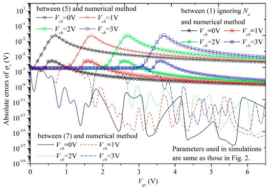 Absolute errors of φs between solution and numerical method vs. Vgs.