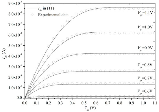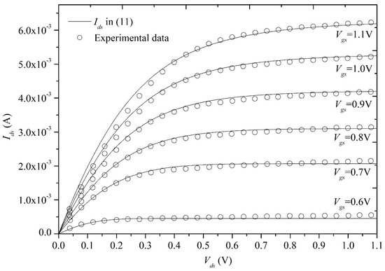 In Figure 4 and Figure 5, we compare the model with Khandelwal’s experimental data [22] for Ids–Vgs and Ids–Vds characteristics in the long-channel device with 11 μm, which does not have a significant presence of channel-length modulation (CLM) in its characteristics. The excellent agreement between the model and the experimental data validates the core drain current model for long-channel devices. In Figure 6 and Figure 7, our model is evaluated for short-channel effects by comparing Ids–Vgs and Ids–Vds characteristics against Khandelwal’s experimental data [22] for a short-channel device with L = 30 nm, which also demonstrate good model accuracy. The presence of CLM is apparent from Khandelwal’s experimental data [22] of output conductance (Figure 7) in this device. The reason why our proposed model can still capture these phenomena quite well is that we introduce “effective drain-source voltage” to describe CLM. According to the transfer characteristics shown in Figure 4 and Figure 6, we can observe that short channel effects lead to subthreshold property degradation and a larger leakage current. According to output characteristics shown in Figure 5 and Figure 7, we can observe that short channel effects result in obvious CLM or velocity saturation.
