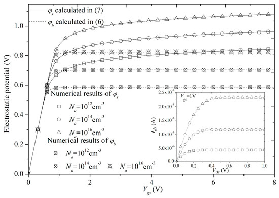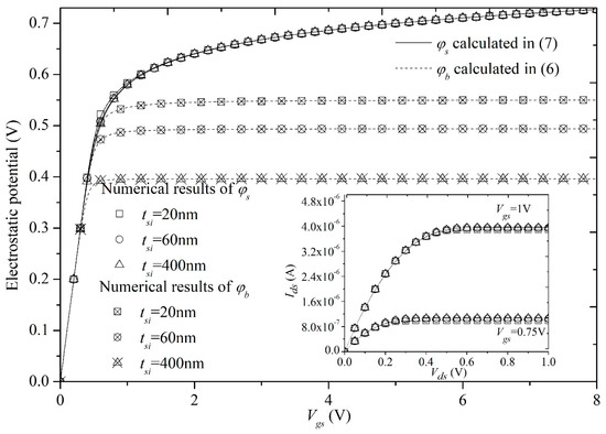 Figure 9. Comparisons between the surface potential calculation scheme and numerical results for different tsi, and the drain current in (11). - Finally, we can observe from Figure 10 that φs, φb, and Ids are in positive correlation with the doping concentration Na, because Na directly decides the value of the free charge density.