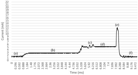 Current profile of the wearable over the inertial measurement unit (IMU) interrupt service routine (ISR). (a) is the idle current with IMU always on (1.2 mA); point (b) is where the system on chip (SoC) wakes up to process the ISR (2.8 mA). Then, the SoC enables the high-frequency clock; point (c) is where the SoC reads the IMU data over the SPI bus, and point (d) is where the IMU data is post-processed (5.2 mA); point (e) is where the IMU data is stored in the FLASH memory using a page write process (12.4 mA); and point (f) is where SoC then returns to idle with just the IMU running.