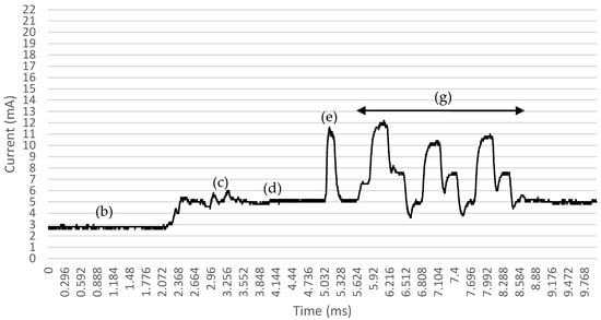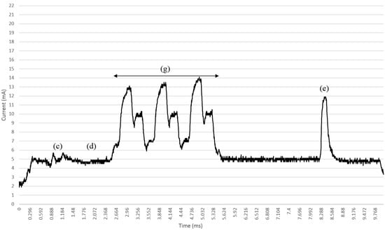 In the specific case of Figure 3, where the FLASH write current occurred at the same time as the BLE ADV transmission, we applied the concept of the scheduler to delay the FLASH write process, and the results are presented in Figure 6. As can be seen in Figure 6, the FLASH write process, point (e), has been delayed in time to separate its current from the BLE ADV transmission, point (g), thus successfully constraining the peak current drawn from the battery.
