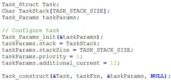In order to create software tasks, each task needs to be instantiated in runtime though the scheduler. The typical task instantiation code is given in Figure 4. It can be seen in Figure 4 that a structure taskParams is created to contain the task parameters required, including the task stack TaskStack (of size TASK_STACK_SIZE) and task priority. Then, the task scheduler can construct the new task in the scheduler in runtime using the information in taskParams and the address of the task.