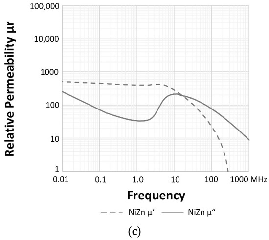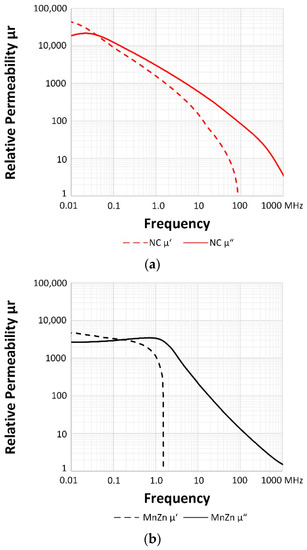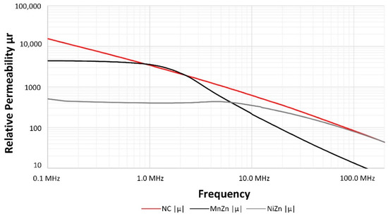 where corresponds to the ferromagnetic resonance frequency, is the magnetic saturation and the initial permeability. This last parameter is measured at low frequency (usually at 10 kHz with a temperature of 25 °C) and it is used for manufacturers to organize the filtering ability of cable ferrites. Equation (2) shows that the higher the frequency of operation, the lower the permeability, and vice versa. Thus, if the material provides high initial permeability, the frequency fall off will be low and vice versa. For this reason, MnZn ferrite cores are normally focused on the high kHz or at most, the very low MHz region since this material yields an initial permeability value between 3000–10,000 [32,33]. With regard to NiZn materials, they usually provide an initial permeability that varies between 500–1200, so they are able to more effectively filter electromagnetic noise within a high-frequency range [34,35]. Otherwise, the NC material shows a much higher initial permeability than ceramics due to its internal structure and manufacturing process that improve its magnetic properties. This results in an important increase in the initial permeability, reaching values of nearly 100,000 [22].