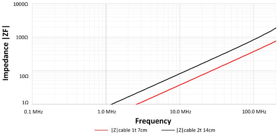 The measurement setup currently in use by manufacturers for characterizing a sleeve ferrite core is based on the measurement of its impedance by means of introducing along the core a wire with a defined length and cross-section, which is connected to an Impedance Analyzer. The wire selected should be as short as possible, but long enough to achieve one and two turns around the sleeve ferrite core. With this conventional method, the influence of the wire in the total impedance measured can only be neglected if its length is short compared to the wavelength and this limit is usually a least 1/10 of the wavelength (λ). Some investigations have evaluated this measurement method and agree that it is not sufficiently accurate for very high frequency characterizations, because if an AWG26 (American Wire Gauge) cable is used, the minimum length required to wind two turns around the NC sleeve ferrite core is 150 mm. As a result, the maximum frequency that can be measured is 200 MHz (following the restriction of λ/10). If this procedure is used to characterize sleeve ferrite cores from 200 MHz, the wire represents a series inductance whose value becomes higher as the wire length increases. At the same time, this length increase causes the SRF to shift to a lower region, considering not only the impedance of the core but also the impedance introduced by the cable [25,26]. In the case of winding only one turn around the sleeve ferrite core, it is possible to use an AWG26 cable with a length of 70 mm with the aim of reducing the influence of the cable in the total impedance measurement. Figure 6 shows the impedance of both AWG cables used to determine the impedance of the sleeve ferrite cores. From these traces, the magnitude of the impedance provided by the two cables employed to measuring the impedance of the sleeve ferrite cores can be observed. It is important to take this fact into account, especially in those sleeve cores whose impedance can be similar to the impedance provided by the cable.