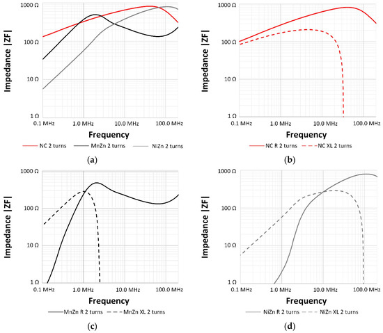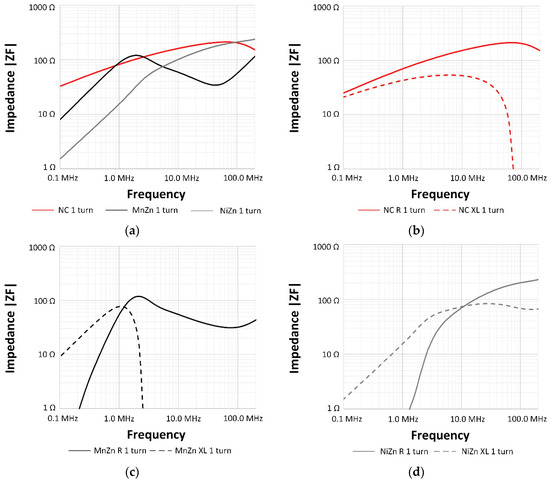 Subsequently, considering these conditions, a calibration procedure has been performed with the aim of reducing the influence of the AWG cable, especially in the frequencies closer to the (λ/10) limit, when the 150 mm cable is employed. Taking this fact into consideration, it is possible to determine the direct impedance measurement through the E5061B Vector Network Analyzer (Keysight, Santa Rosa, CA, USA) connected to the Terminal Adapter 16201A (Keysight, Santa Rosa, CA, USA) and the Spring Clip Fixture 16092A (Keysight, Santa Rosa, CA, USA) [40]. These fixtures are internally compensated by impedance standard calibration in order to take into account the electrical length path and the impedance variations caused by parasitic elements. The measurements of R and XL obtained from the three sleeve ferrite cores with this setup are shown in Figure 7. Figure 7a shows the magnitude of the impedance measurement in which the most effective range of EMI suppression in the NC sleeve ferrite core compared to the ceramic cores analyzed can be observed. This minigraph shows that MnZn provides the higher impedance from 0.88 MHz to 2.73 MHz and NiZn offers a more effective behavior from 91.61 MHz, whereas in the rest of the frequencies, NC sleeve ferrite yields the best performance. If this data is compared to the permeability traces, it is possible to observe a correlation between both characterization methods, since MnZn provides a greater response than NC within a similar frequency region, which is shown in the permeability graph. With regard to the comparison between the NC and NiZn sleeve ferrite core, NC shows a higher impedance value of up to 91.61 MHz. At this frequency value, the inductance component of the analyzed NC sleeve ferrite core reaches negative values that match the SRF point. Consequently, the capacitive component of the core generates a degradation in the impedance performance, reducing it sharply with respect to NiZn sleeve ferrite core. In Figure 7b–d, the resistive (R) and inductance (XL) components can be observed in order to know the contribution of each of them related to the total impedance. As described above, the studied sleeve ferrites show higher values of XL within the low-frequency region; however, these become less important as the frequency increases if compared to the R component. The resonance frequency of MnZn and NC cores is located at 2.02 MHz whereas the resonance frequency of NiZn is located above 200 MHz.