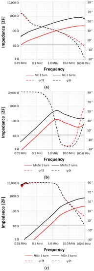 These graphs also allow one to determine from which frequency value the phase angle of each sleeve ferrite becomes negative and, therefore, the component shows a capacitive behavior. As it has been described, in the case of MnZn, this frequency value corresponds to the , whereas for NC and NiZn, it is possible to observe that the phase angle trace crosses 0° at a lower frequency value, which demonstrates their complex relative permeability traces. This effect is caused by the shift of the SFR due to two factors: (a) the stray capacitance added to the sleeve ferrite response when the cable is winding it and (b) due to the self-resonance produced by the sleeve ferrite core dimensions (with smaller cores of the same material, the SFR appears at a higher frequency value). Therefore, the impedance magnitude is increased by winding a higher number of turns around the sleeve ferrite core but, at the same time, the effective frequency range is reduced.
